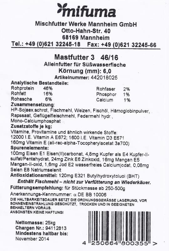 Das Futter für unsere Tiere beziehen wir von einem Unternehmen, welches Fischfutter überwiegend an professionelle Teichwirte zur Produktion von Speisefischen liefert. Damit gelten für dieses Futter strengere Vorschriften als für Zierfischfutter. Die mit wissenschaftlichen Methoden gewonnenen Erkenntnisse zur Ernährung von Karpfen von Kurt Schreckenbach halten wir für übertragbar auf die Koiernährung und achten deshalb zum Beispiel auf einen nicht zu niedrigen Fett- und Energiegehalt. Die meisten Koifutter enthalten wesentlich geringere Fettanteile, was die Lagerfähigkeit und damit die Akzeptanz des Handels verbessert. Wir lagern das Futter kühl und dunkel und achten auf seine Haltbarkeit. Unsere Erfahrungen damit sind bisher sehr gut.